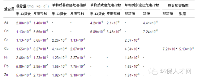 基于健康风险评价模型及相关参数指标,利用污泥中重金属检测结果对污泥的重金属健康风险进行评价,儿童健康风险评价结果与成人健康风险评价结果分别如表 9和表 10所示.对于目标暴露人群为儿童,以手-口摄食为暴露途径时,单一物质非致癌危害指数高的元素是Cu,危害指数为1.21×10-1;以皮肤接触为暴露途径时,单一物质非致癌危害指数高的元素同样是Cu,其危害指数为1.51×10-3,各重金属对非致癌风险贡献率从高到低的顺序是Cu > Cr >Zn> Pb > Ni.污泥重金属非致癌综合危害指数为2.02×10-1,致癌综合危害指数为1.44×10-4,其中,以手-口摄食为暴露途径时,其非致癌与致癌风险分别是2.00×10-1和1.42×10-4,以皮肤接触为暴露途径时,其非致癌与致癌风险分别是2.62×10-3和1.78×10-6,手-口摄食暴露途径为主要的暴露途径.本次污泥金属健康风险评价研究中,非致癌综合危害指数为1.09×10-1,并未达到非致癌风险警戒值“1”,对于儿童来说并不存在非致癌风险;污泥重金属致癌综合危害指数为1.44×10-4,超出USEPA提供的可接受区间(1×10-4 ~ 1×10-6),存在一定的致癌风险.但需要指出的是,为了揭示大的致癌风险值,该研究是假设长期生活在布满污泥的环境中,因此,实际生活中,可能并不存在致癌风险.