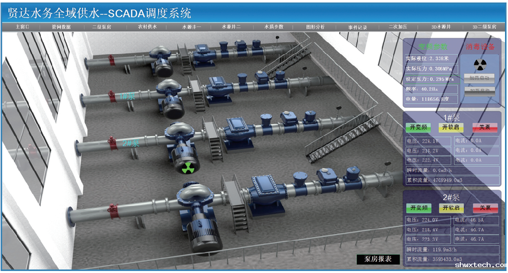 ◆ 系统可以实时监测水源井水泵工作情况,包括:电流、电压、电能、泵开关状态、保护状态、出水压力、出水流量。可以远程起停水源井水泵。